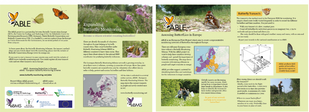 Here you can download an eBMS leaflet explaining the network together with the project ABLE for promoting butterfly monitoring in Europe. You can find this leaflet in several languages: