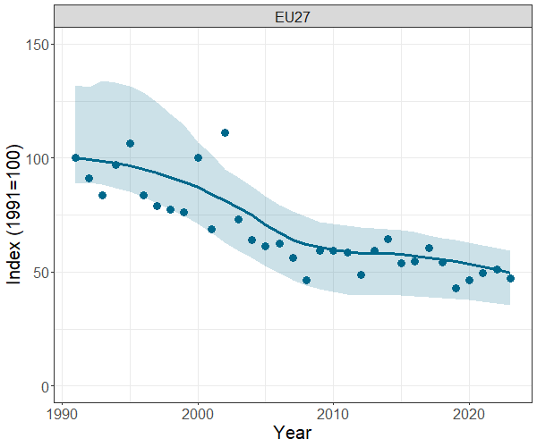 We are pleased to inform you that we have updated the EU Grassland Butterfly Index, 1990-2023. We produced a technical report to describe the indicator, it represents a major update with the last three years up to 2023, through the incorporation of more and expanded datasets, schemes and the 27 EU countries (6,000 transects, and 17 species). It is the first major output from the EMBRACE project. This would not have been possible without the effort of all the collaborators, national schemes, and volunteers that provide voluntary the data to eBMS database. Our appreciation to all of them.