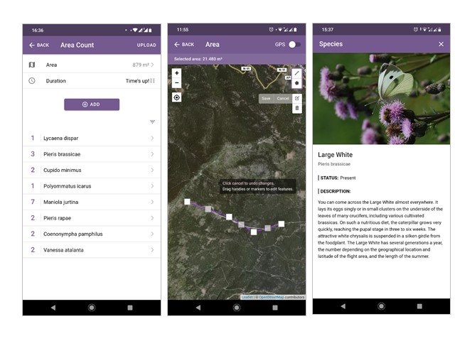 It was created to do 15-min Count, counting butterflies for 15 minutes anywhere in Europe. The GPS tracks your route, area, or point of your search. You can also draw the recorded area. All transects registered on the eBMS website can be also done with the app! Just download it and log in with your eBMS account.